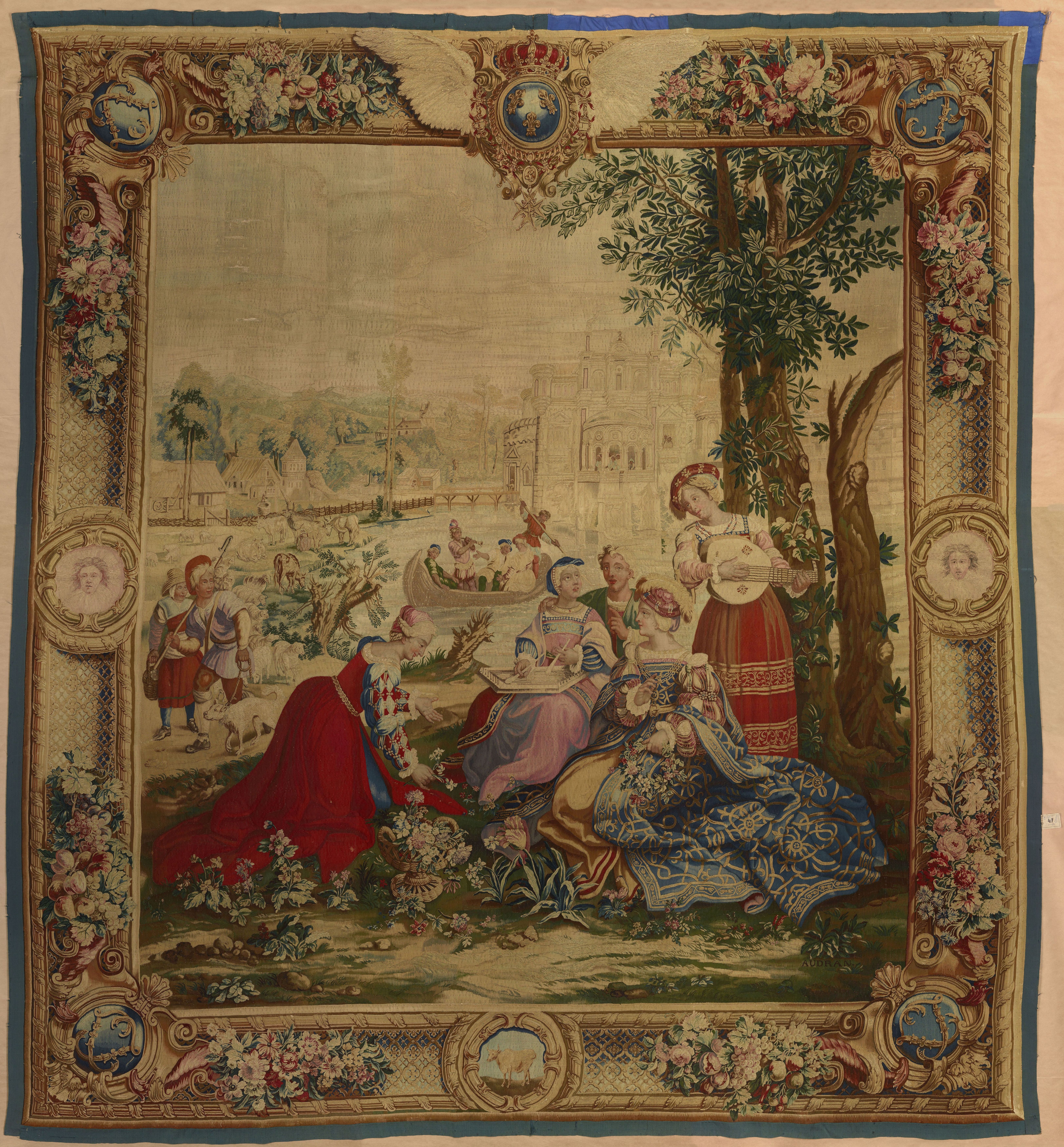 Une dame, assise sur l'herbe, tenant une couronne à la main, se retourne vers la gauche ; une autre femme joue de la cithare, une autre de la mandoline, une quatrième cueille des fleurs ; à gauche du berger, un chien et des moutons. Bordure à losanges jaunes sur fond bleu ; aux angles, quatre cartouches portant les deux L entrelacées ; les armes de France au milieu de la bordure supérieure, au milieu des côtés, mascarons portant des soleils. Neuvième tenture, quatrième bordure.