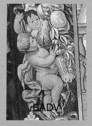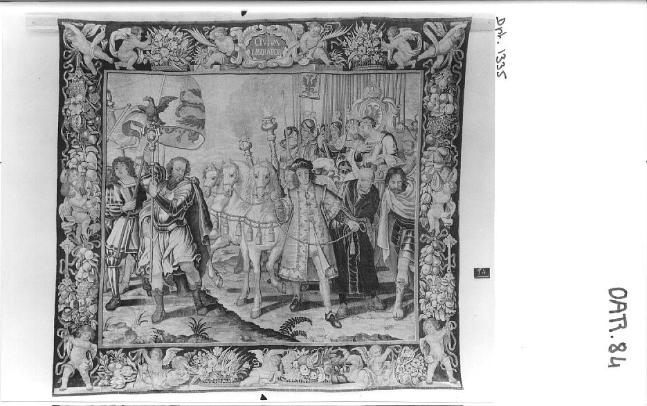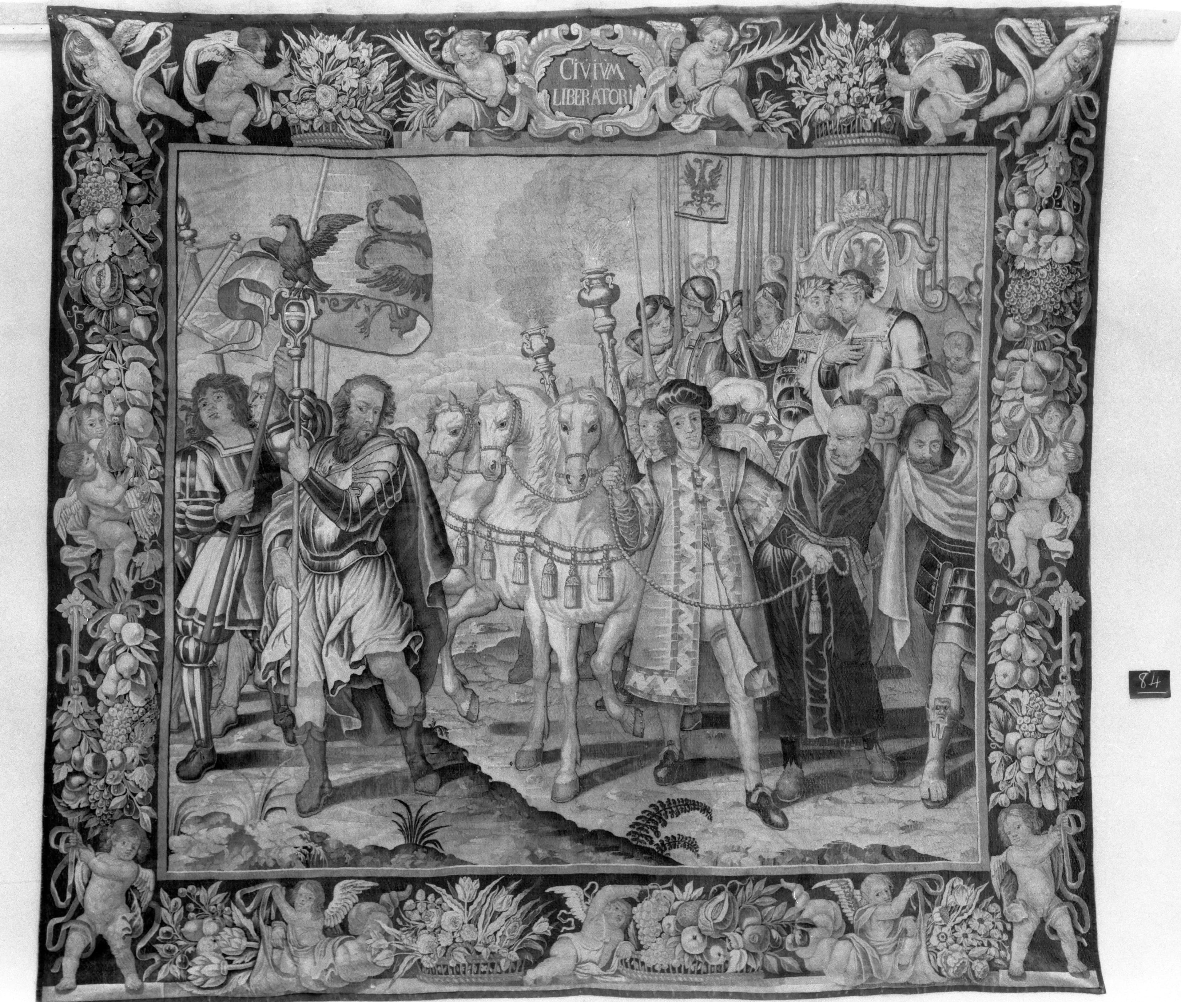 Suite de l'Histoire de Charles Quint (OAR 79-85) ; tapisseries à dominante rouge dont les bordures sont faites d'amours, de corbeilles et de paniers de fleurs, de cornes d'abondance et de guirlandes de fleurs et fruits au naturel ; au milieu de la bordure supérieure, un cartouche à inscription.