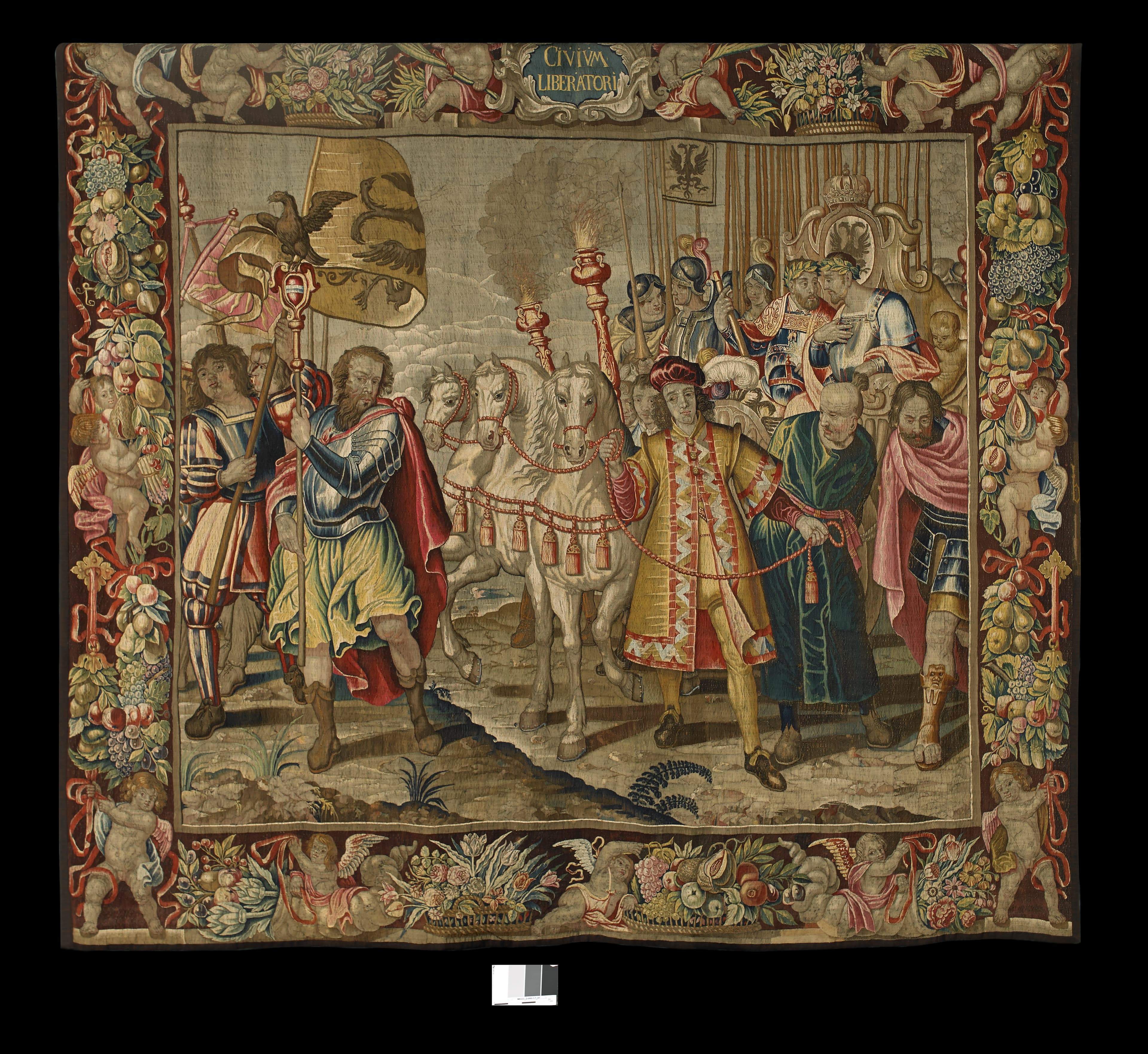 Sur un char de triomphe sont assis côte à côte Charles Quint et Philippe II (?) ; à droite, deux personnages enchaînés ; à gauche des porte-étendards. Inscription "B" gothique traversant une couronne et broche à tisser.
