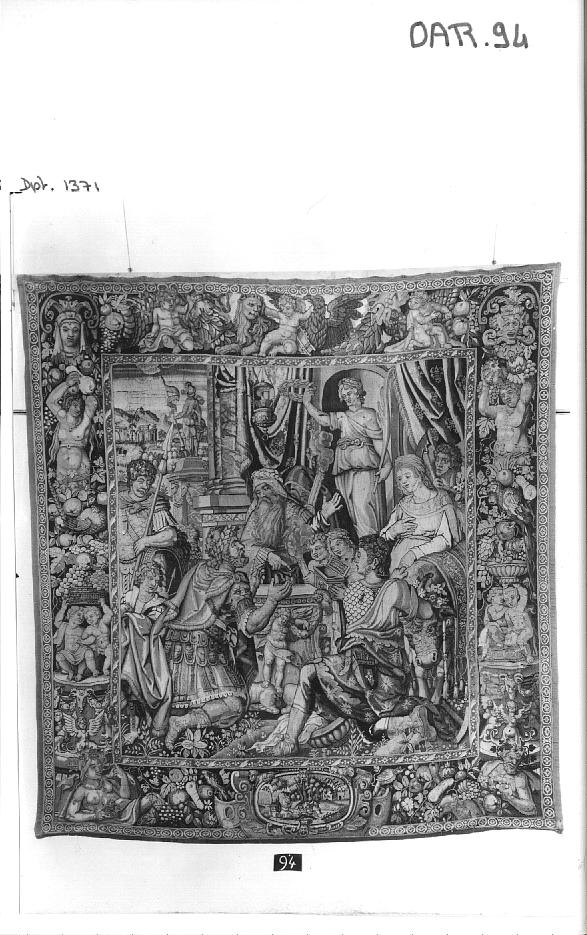 Cette tapisserie fait partie d'une tenture de six pièces, l’Histoire de Pompée (OAR 94 à 98 et 664), anciennement identifiée comme l’Histoire de Scipion.