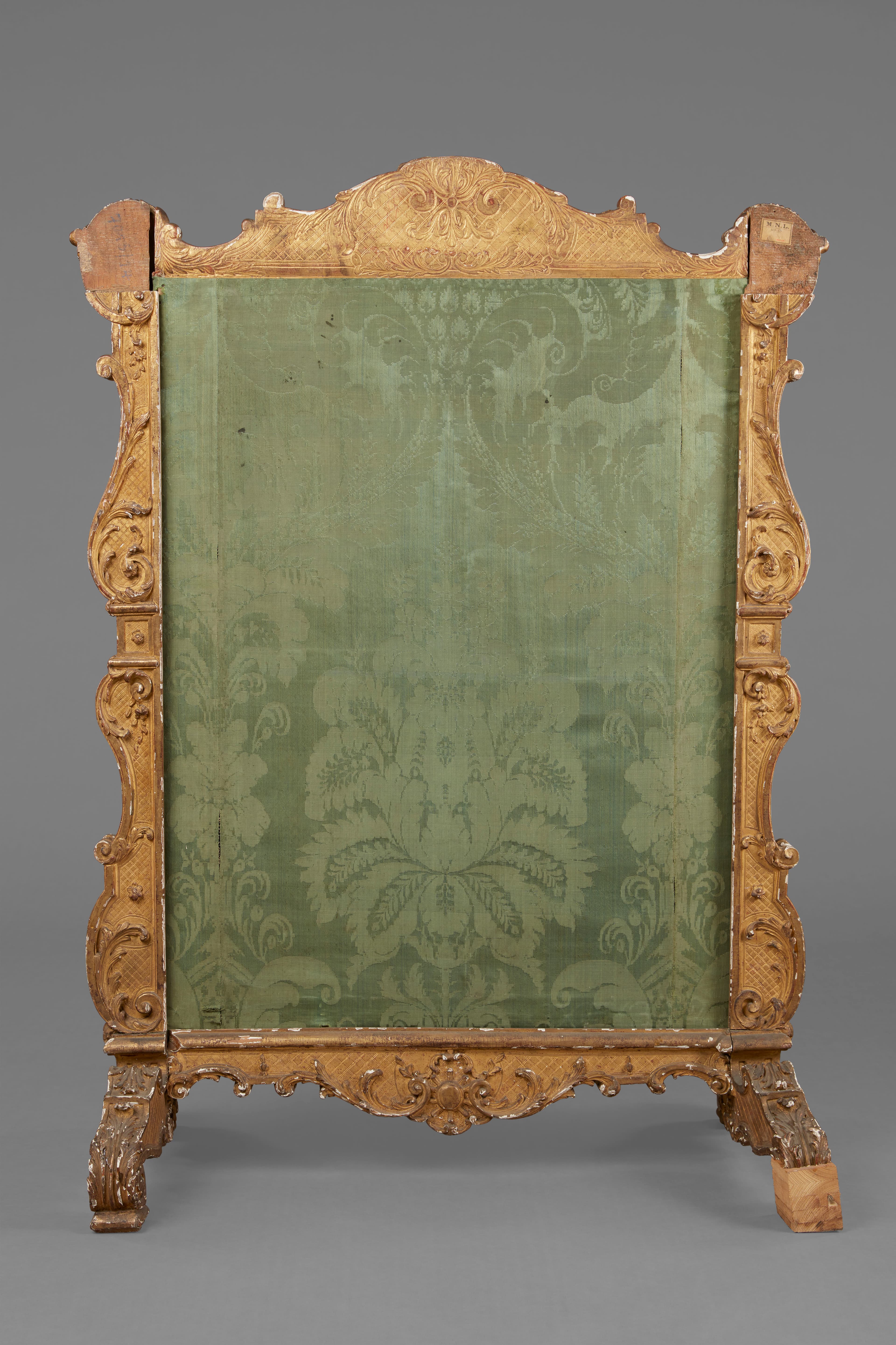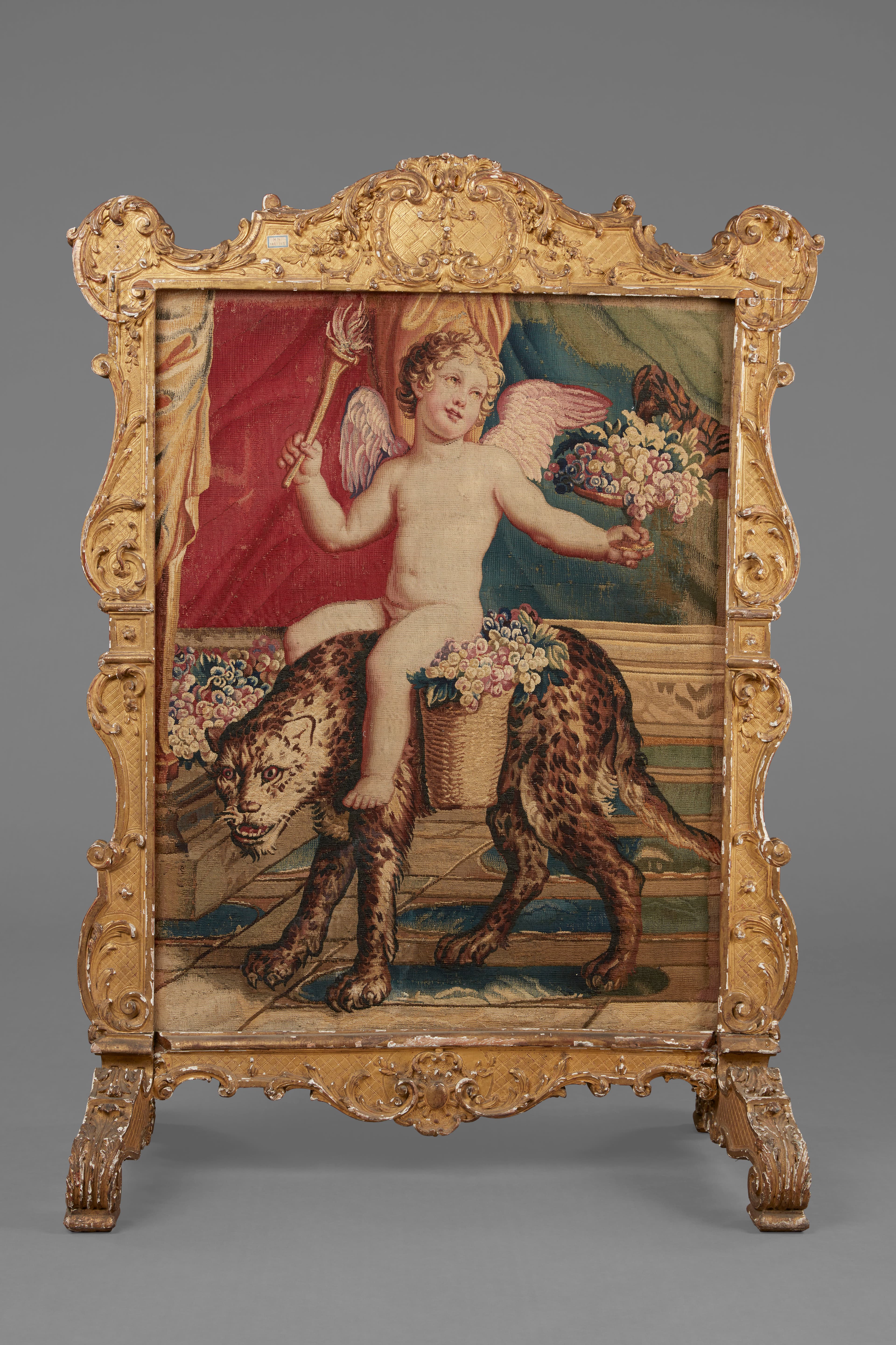 Décor sculpté de volutes feuillues sur fond quadrillé, les pieds à doubles patins ; au centre, le panneau mobile est garni d'un fragment de la tapisserie "Triomphe de Bacchus" d'une tenture de basse lisse des "Triomphes des Dieux" d'après Noël Coypel (1628-1707). Ce fragment représente un amour à cheval sur une panthère et portant de la main gauche un bouquet et de la droite une torche. Le revers du panneau est garni de damas vert.