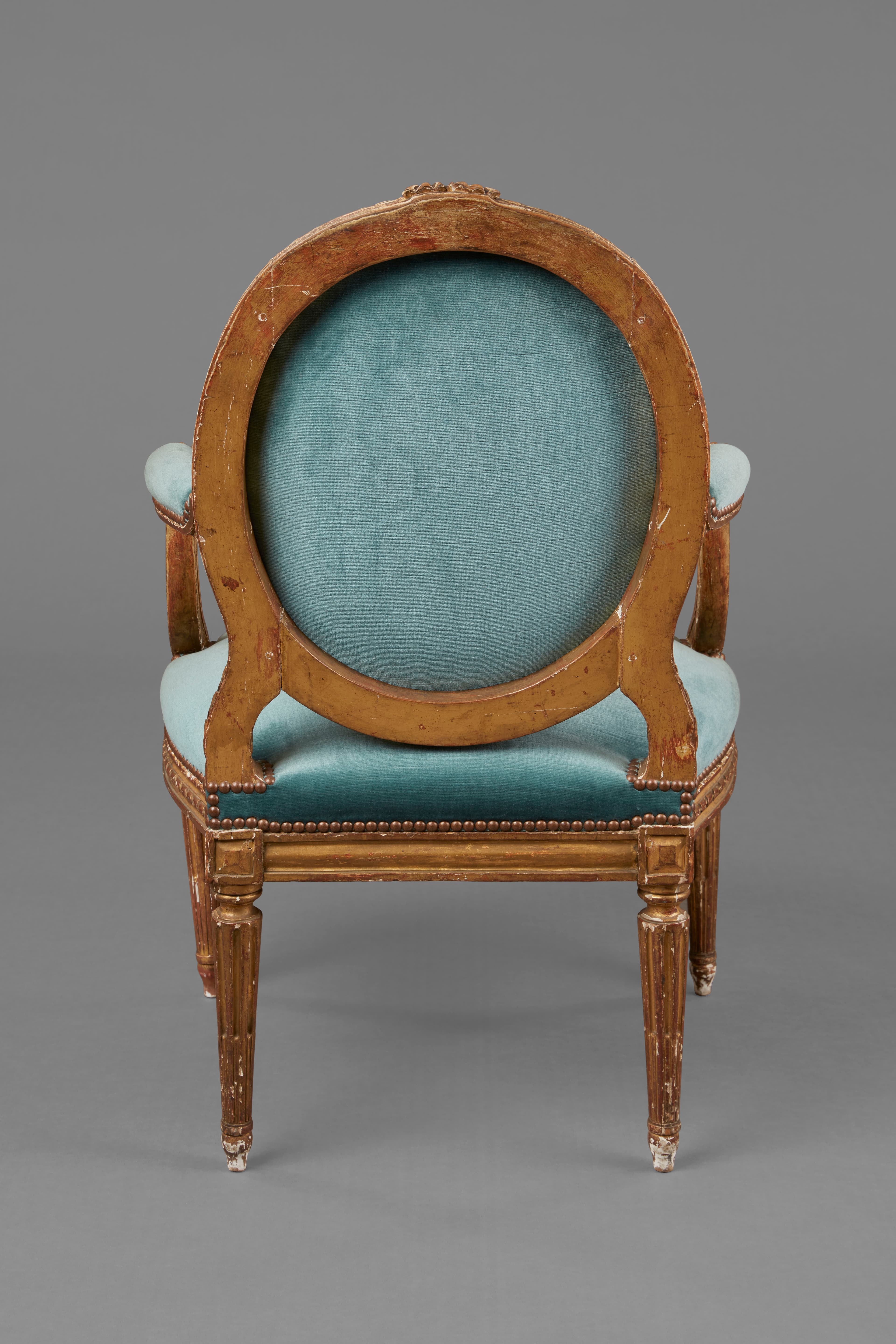 Fauteuil de bois sculpté et doré. Le dossier ovale est décoré d'un ruban torsadé et d'un nœud de ruban à la partie supérieure. Accoudoirs à manchettes et supports à ruban torsadé et feuille d'acanthe ; dés à rosaces, ceinture à ruban ; pieds fuselés et cannelés ; actuellement garniture de velours bleu, rouge à l'origine.