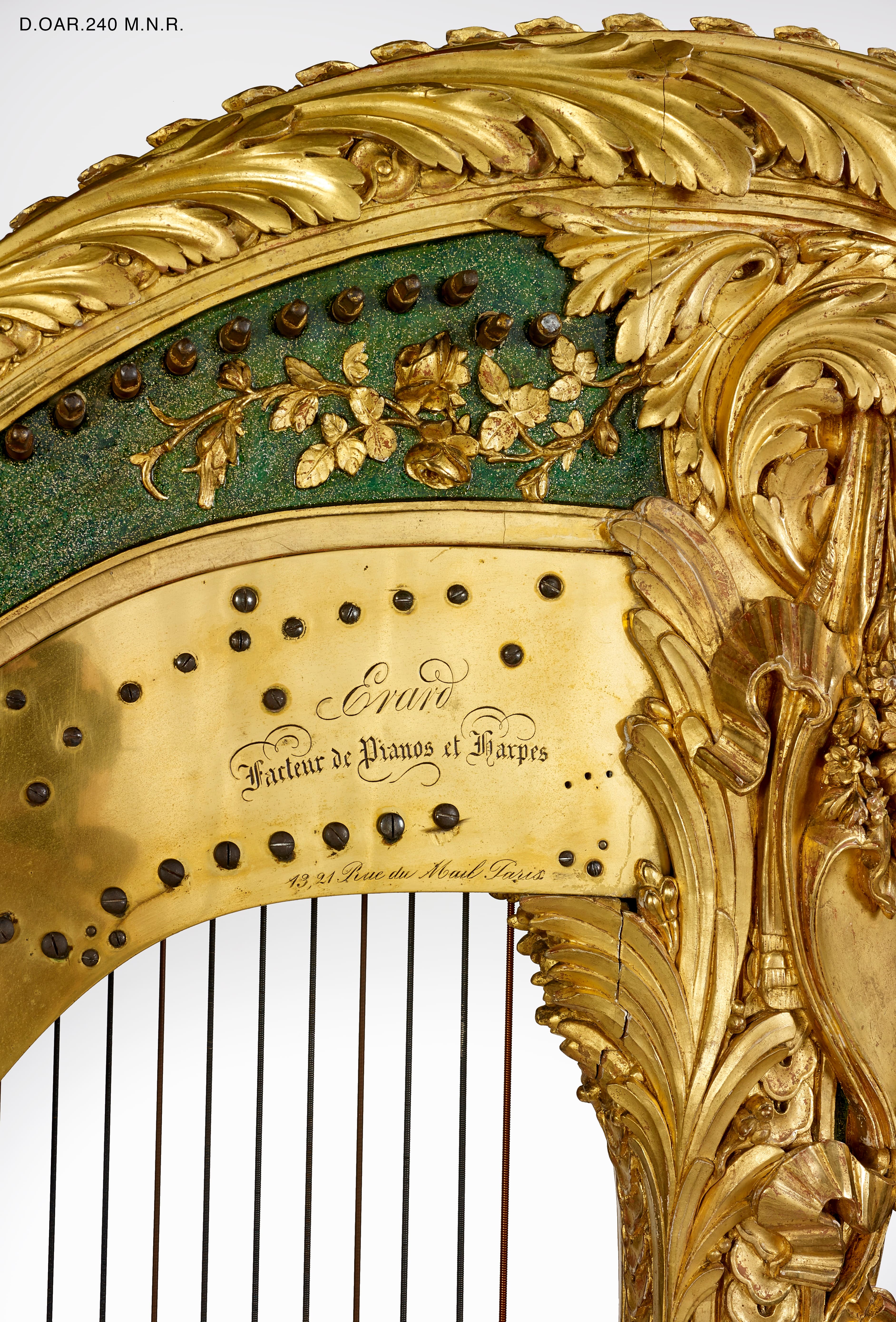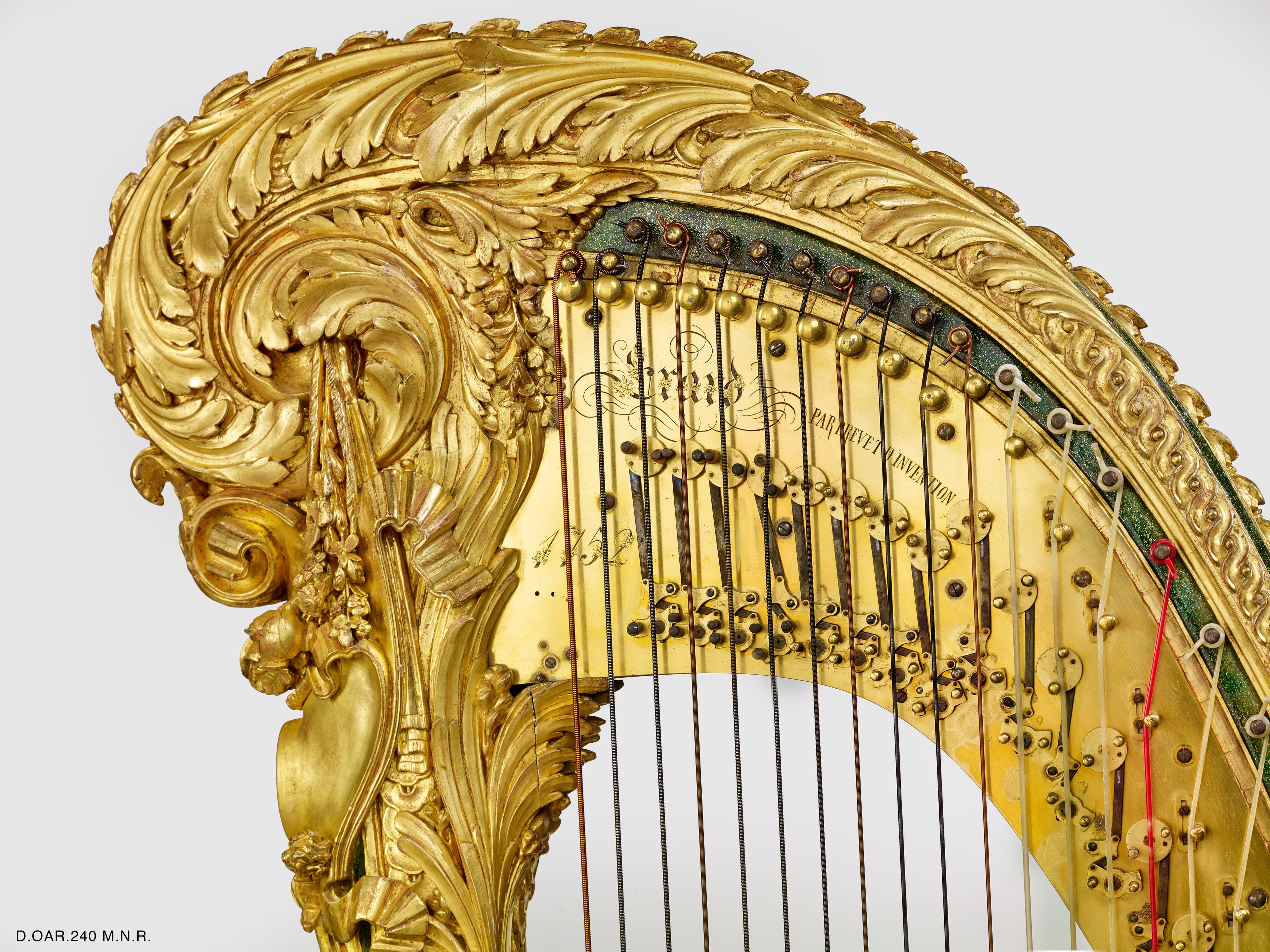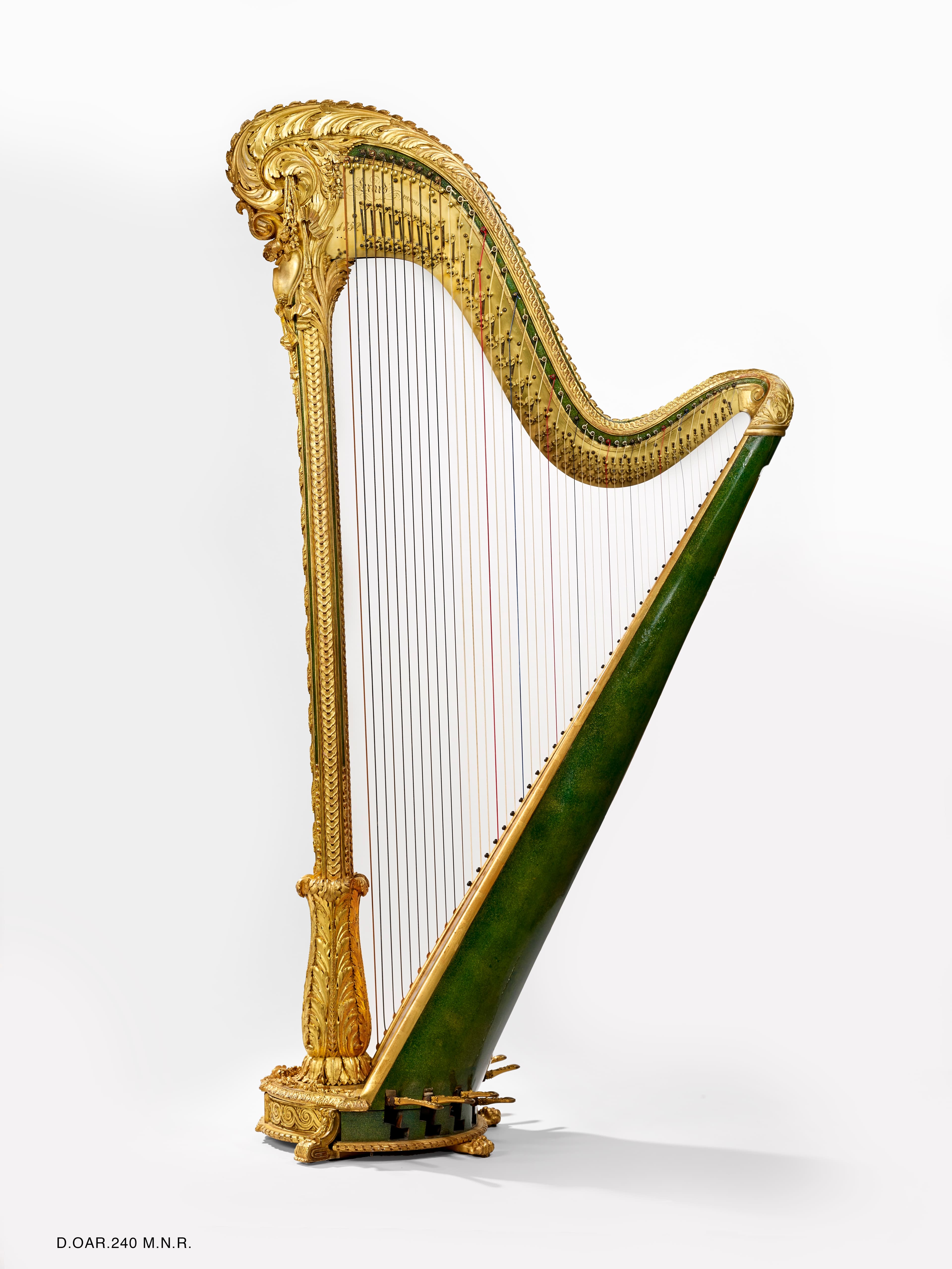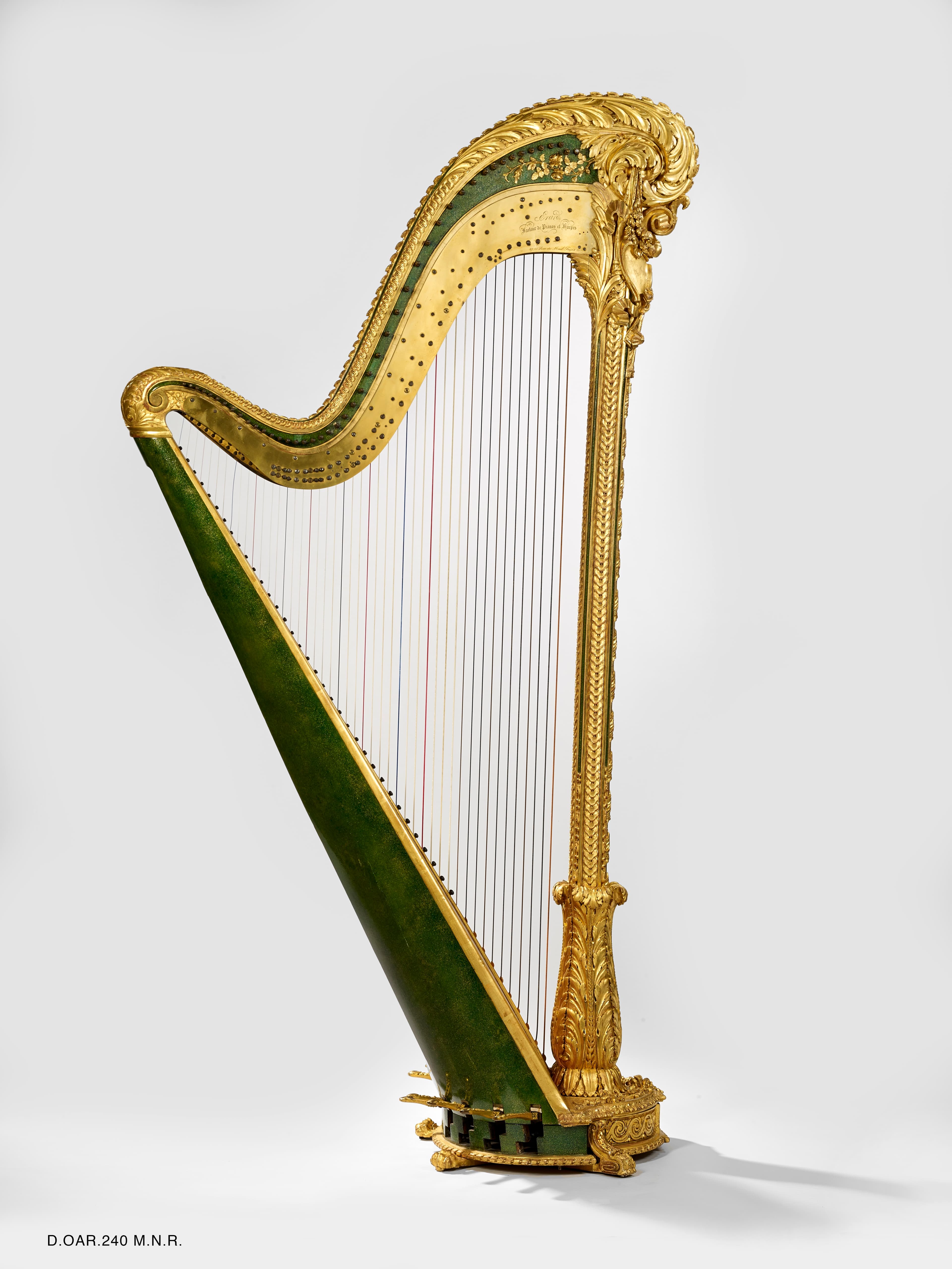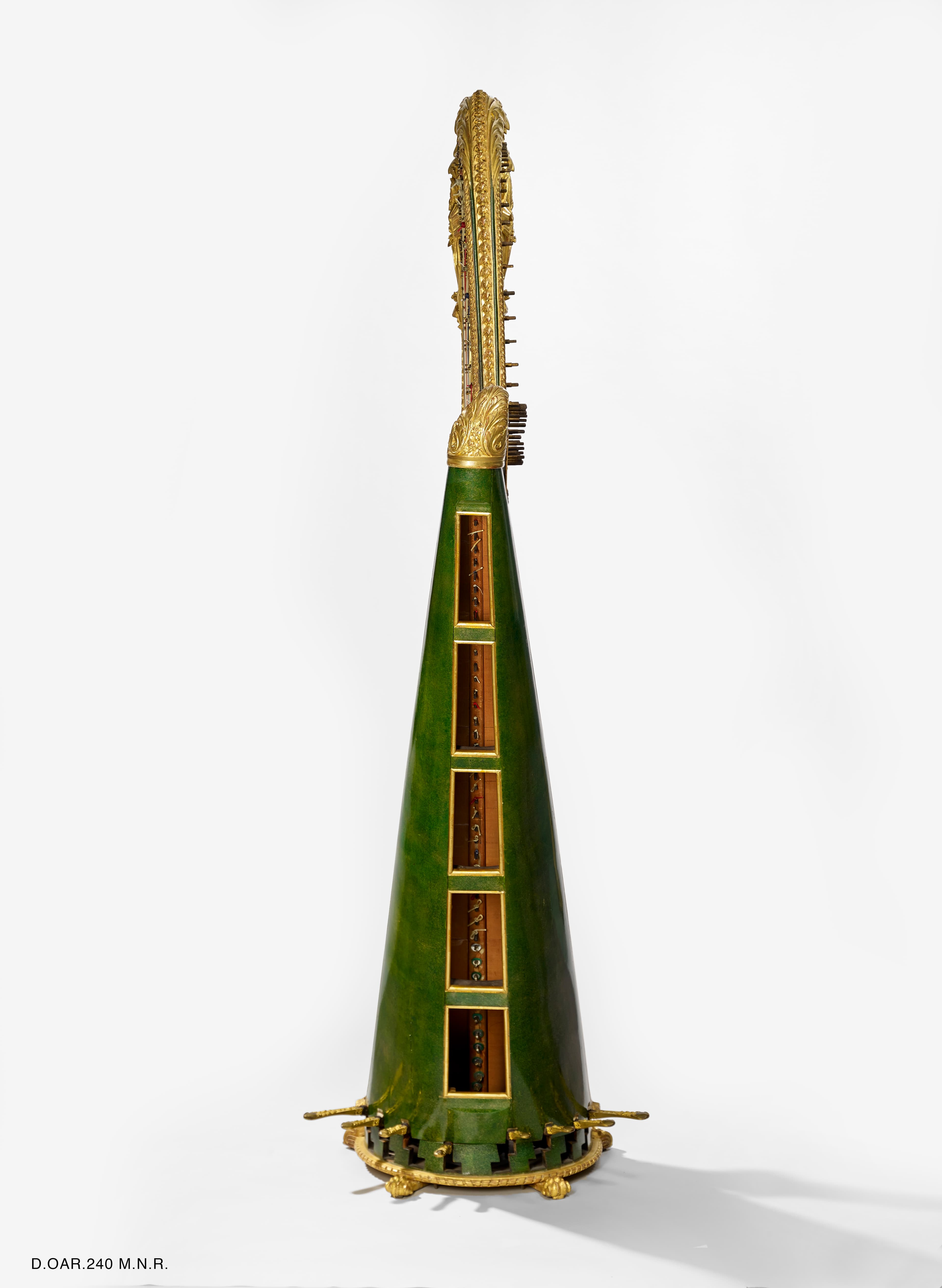 Harpe de bois sculpté, doré et rehaussé de peinture verte, décor d'amours, de piastres, de feuilles d'acanthes et de grecques.