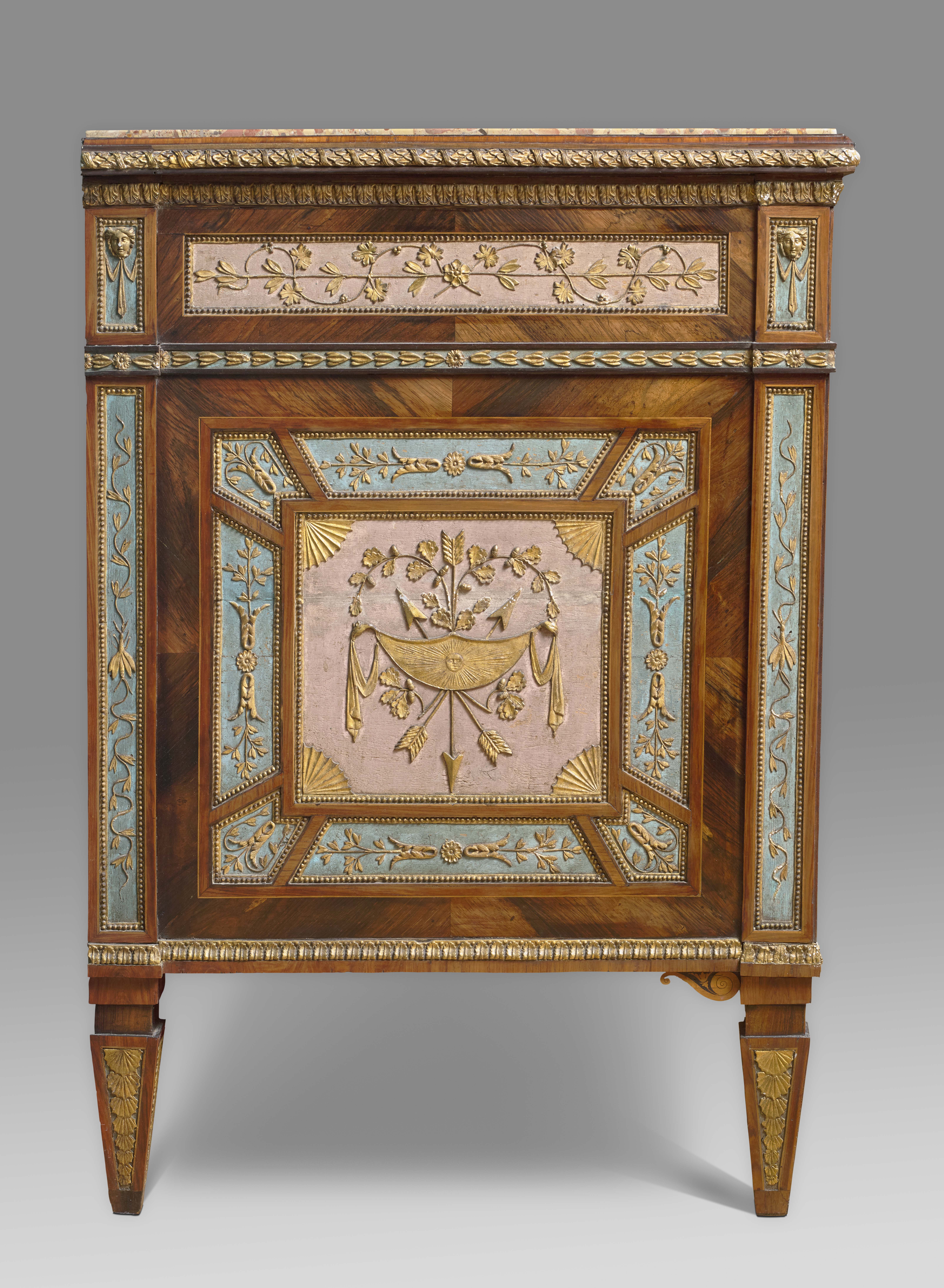 Commode rectangulaire à décor de marqueterie de stuc et de bois peint ouvrant à quatre tiroirs ; la ceinture à frise de feuillages sur fond rose ; la face décorée d'un panneau à encadrement rectangulaire de fleurons sur fond bleu, portant en son centre une grande coupe, ornée d'oiseaux et cantonnée de rinceaux ; pieds en gaines.
