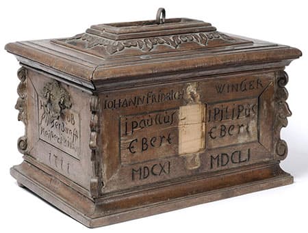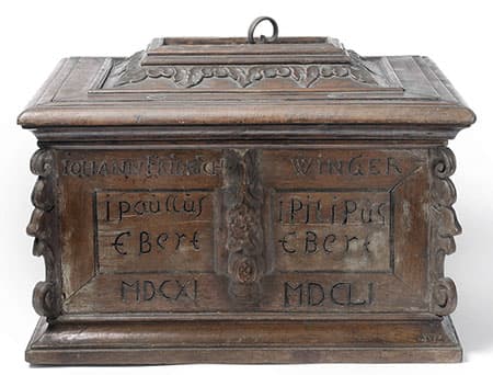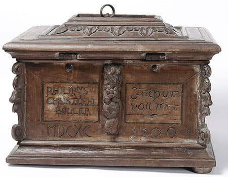 Petit coffre rectangulaire en bois ciré décoré aux angles de grotesques vus de profil, et au centre des grands côtés, de fleurs en relief ; sur chaque face, des inscriptions.
