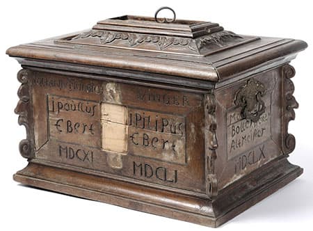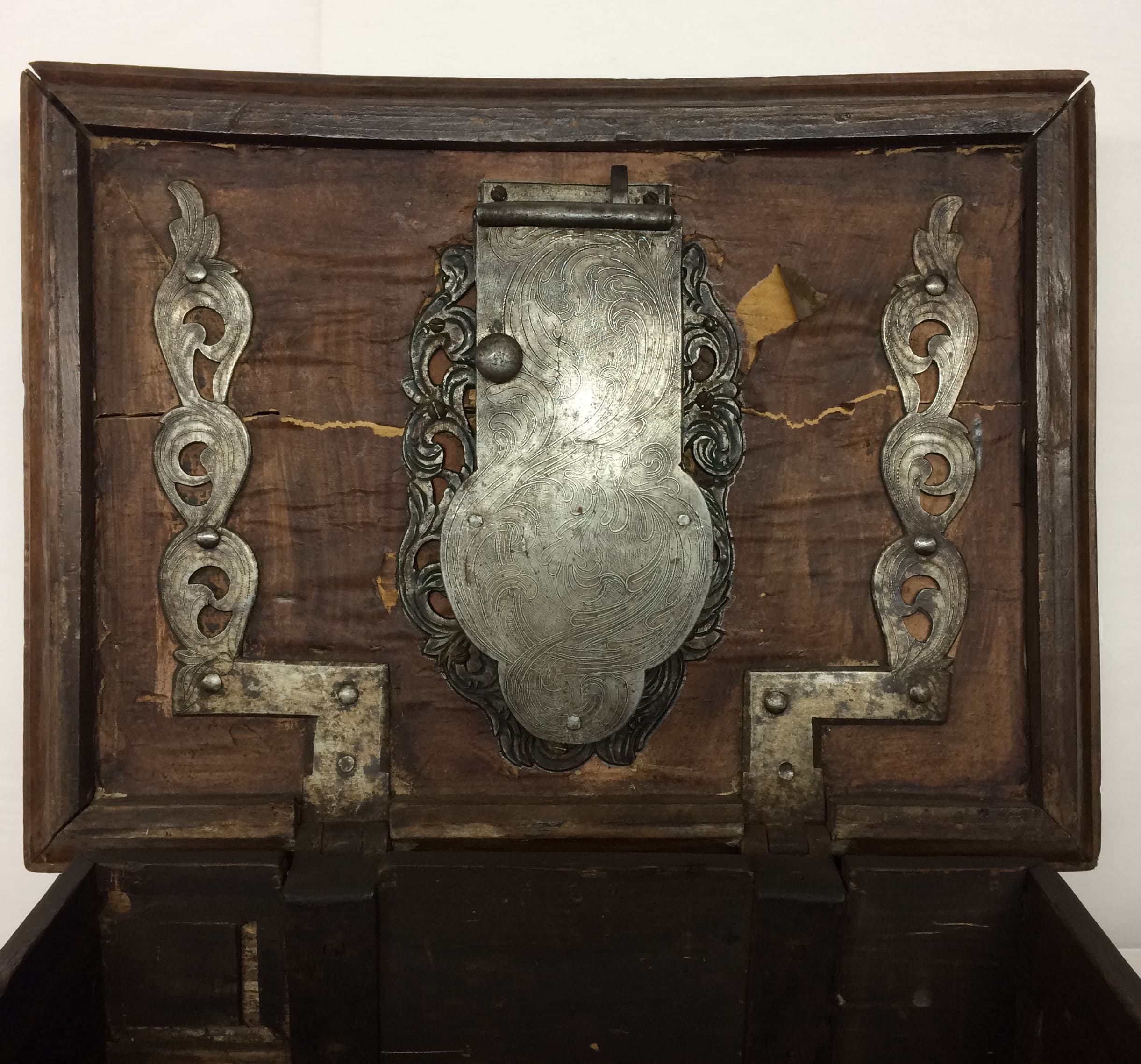 Étiquette à l'intérieur du coffre, sur le fond, étiquette cartonnée avec œillet : à l'avers à l'encre "42826" ; au revers à l'encre "Ross[b]ach/Neumarkt/174" ; au crayon graphite "Mü.Obb."