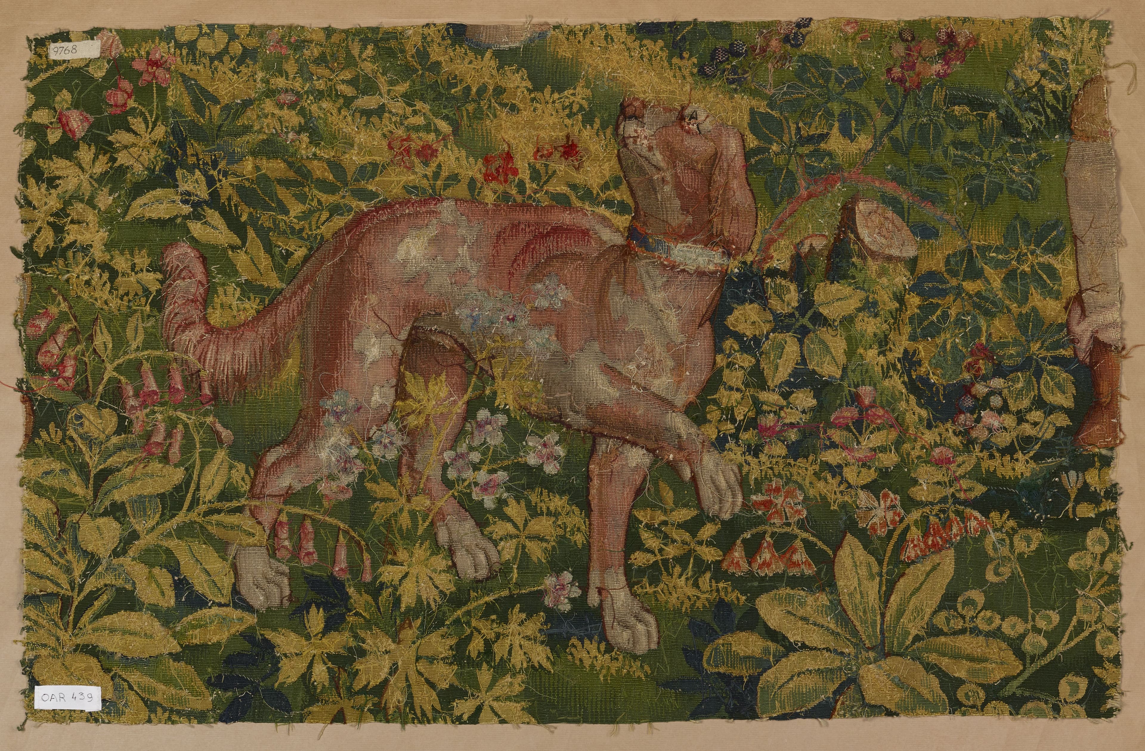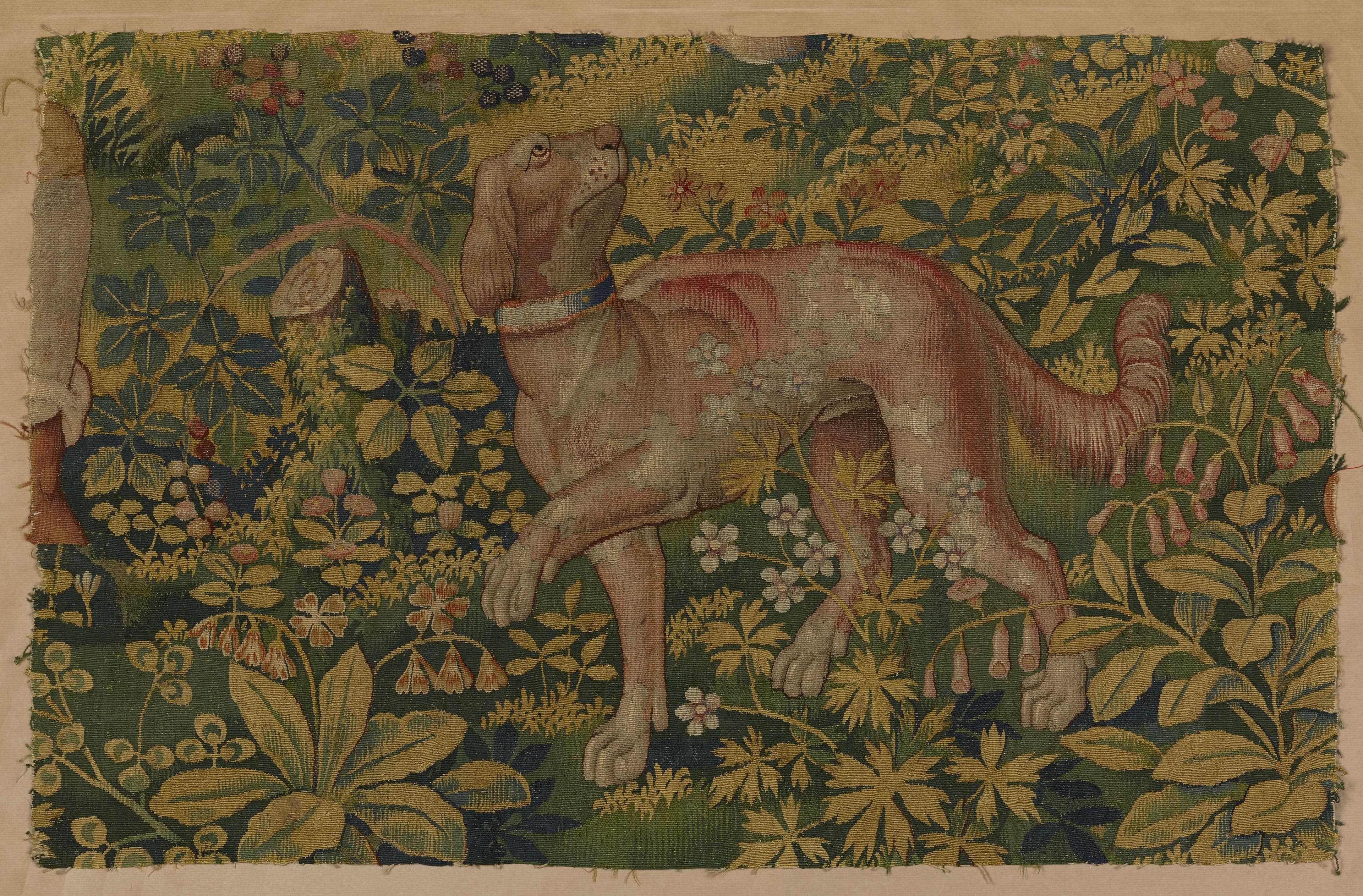 Fragment de verdure à décor de fleurettes, au milieu duquel est représenté un chien, marchant vers la gauche, la tête tournée vers la droite et regardant en l'air.