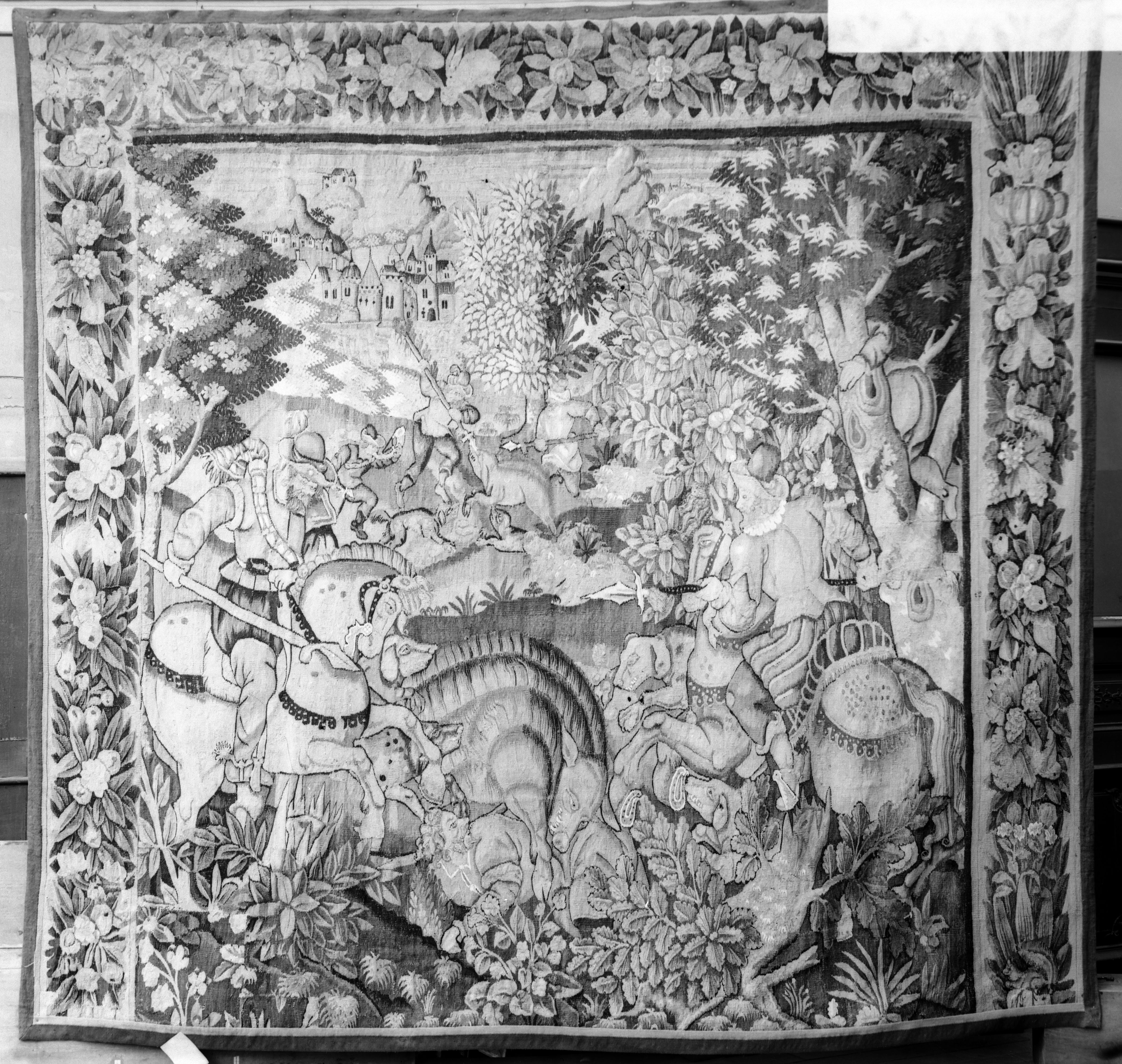 Tapisserie à trame assez grossière représentant un paysage de forêt avec au fond un château. Deux personnages à cheval et 3 autres à pied chassant le sanglier ; un autre personnage, à droite, est grimpé dans un arbre. Bordure (sauf en bas) à fruits, feuilles et oiseaux.