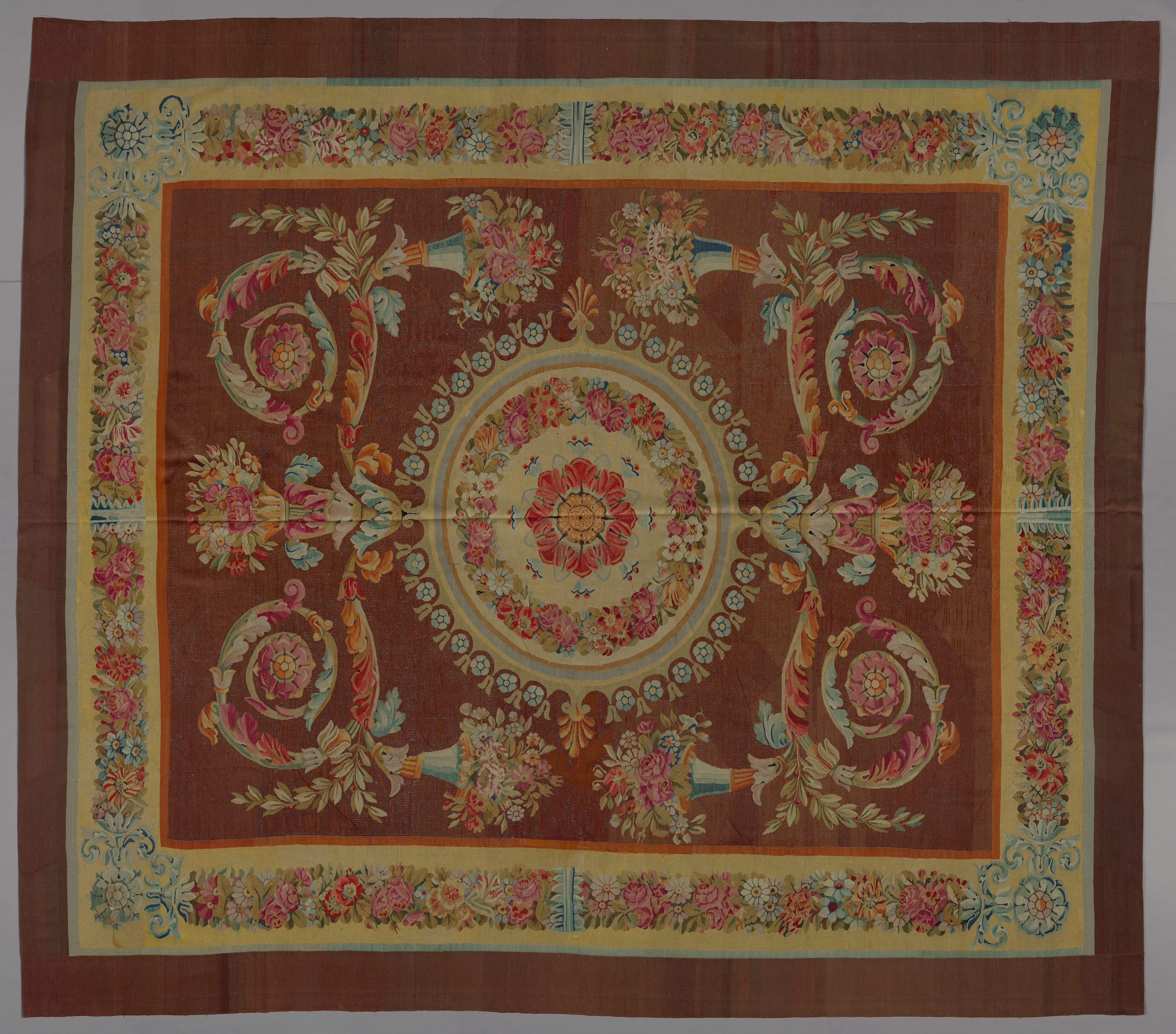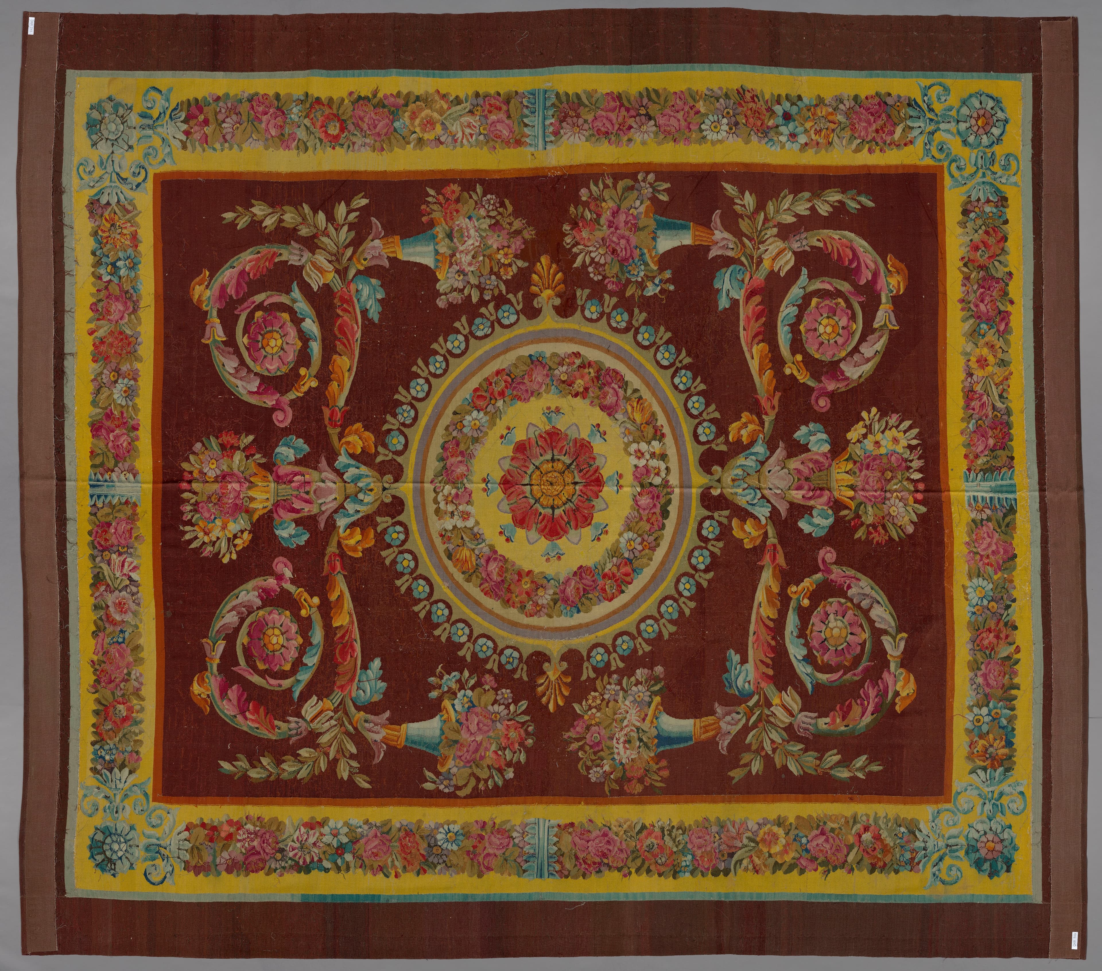 Tapis dont le champ principal à fond marron est occupé au centre par une rosace avec guirlande de feuilles et de fruits sur fond jaune crème, présentant deux palmettes vers l'extérieur. Deux côtés de la rosace sont prolongés par un motif symétrique de vase de fleurs, dont la base laisse partir vers la bordure deux volutes symétriques constitués de rinceaux végétaux. Une corne d'abondance s'échappe de chaque rinceau. La bordure est constituée de guirlandes de feuilles et de fleurs dont les tons dominants de rose, blanc et vert se détachent d'un fond jaune. Une rosace est tissée à chaque angle. Cette bordure est comprise entre une bande verte et une bande orange. Le bord extérieur du tapis est marron.