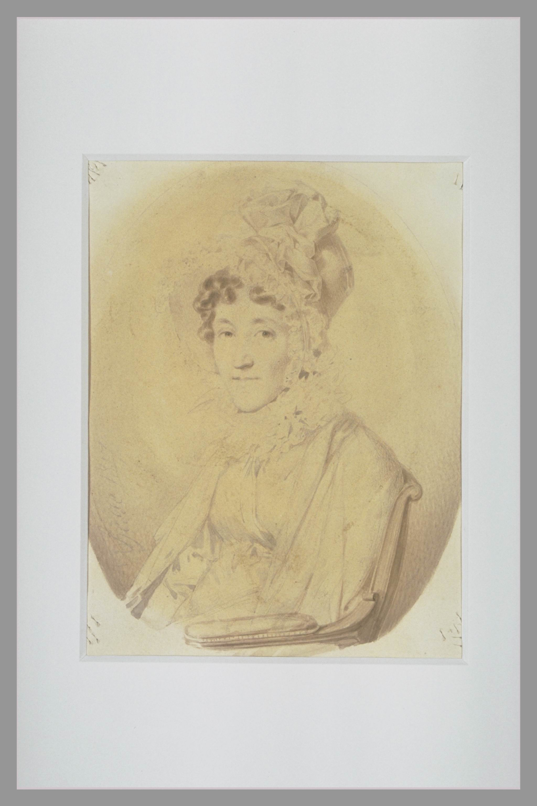portrait d'inconnu (femme : assis, de trois-quarts, en buste, chapeau, châle)