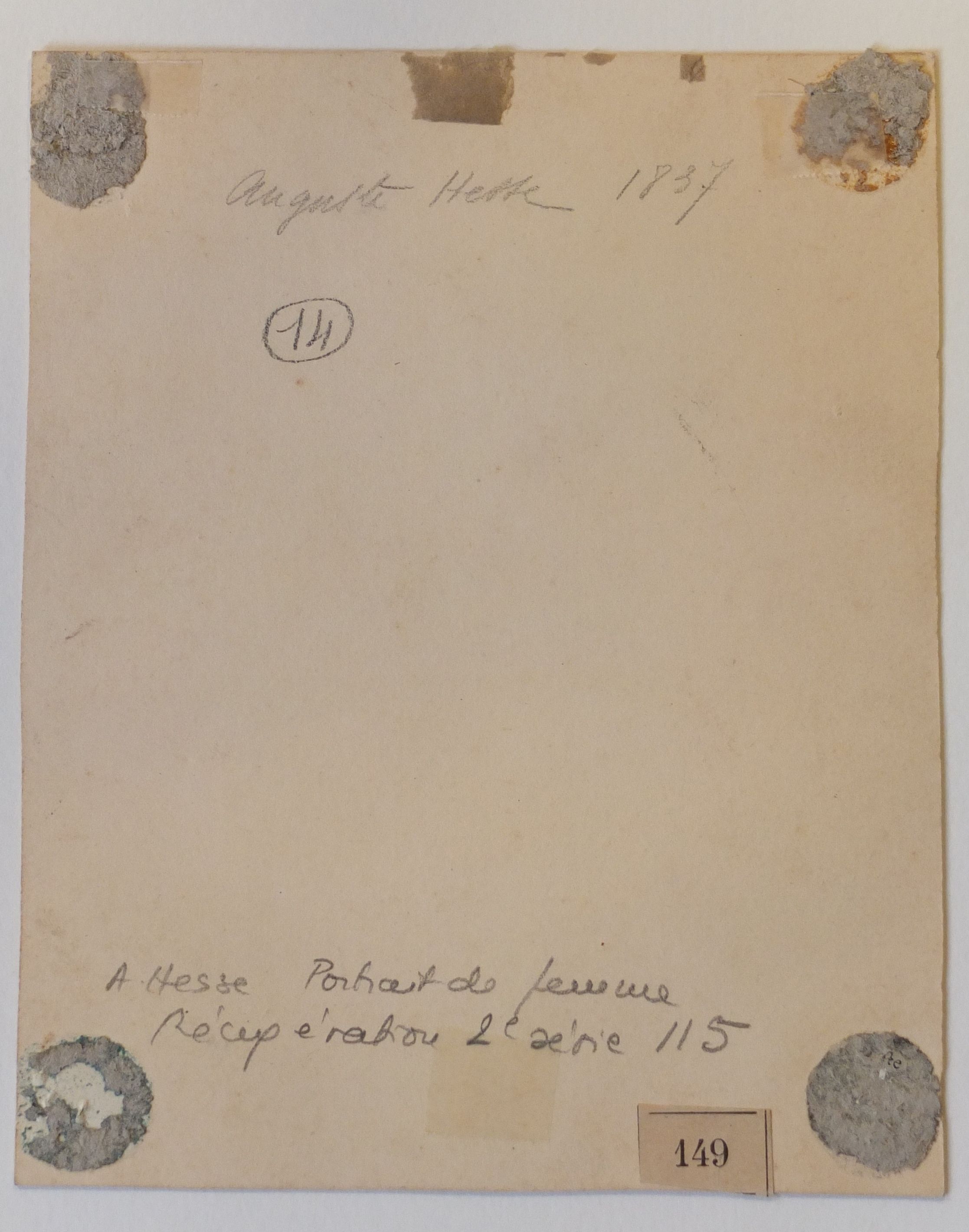 -"A. Hesse /Portrait de femme/récupération 2ème série 115" (récolement A. Sérullaz).