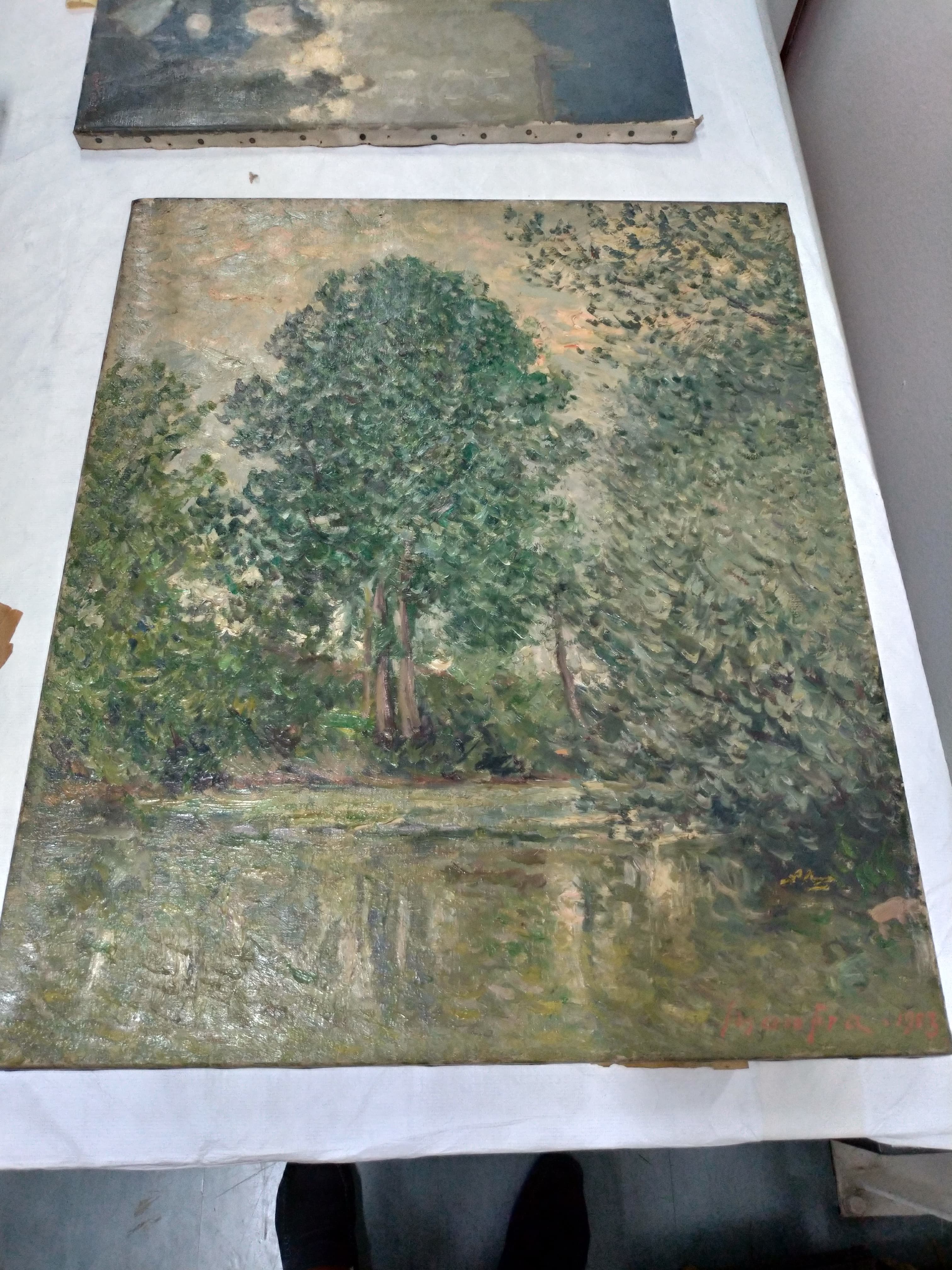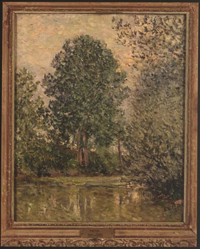 Au premier plan, mare - sur la rive prairie avec arbres (à droite et à gauche deux saules, au centre un peuplier).