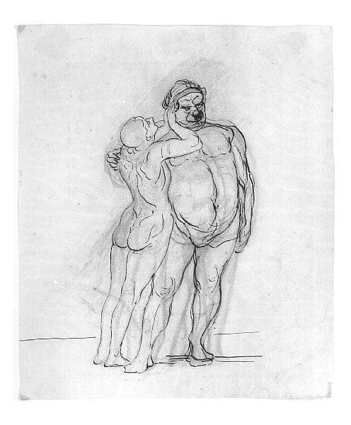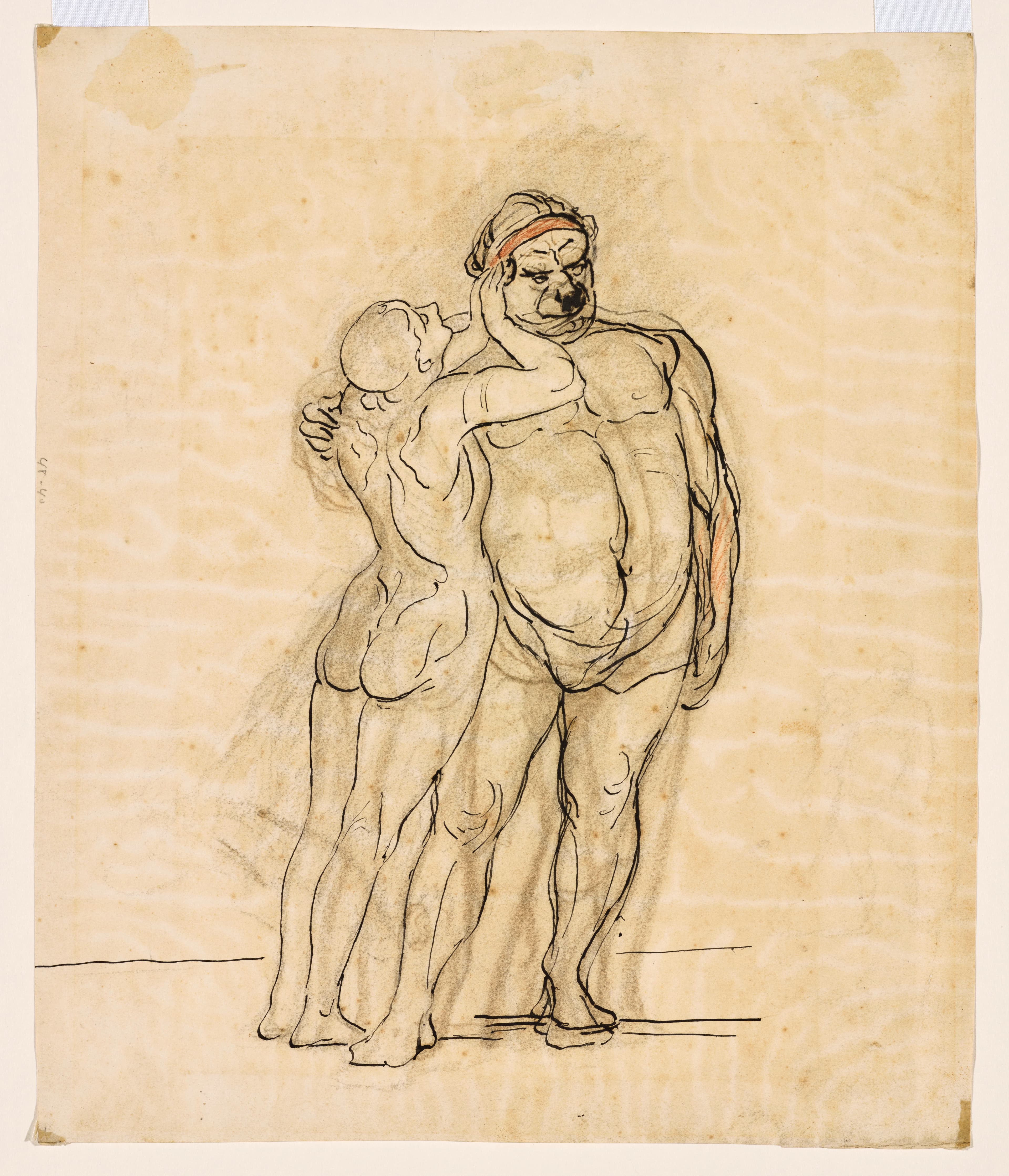 Papier ; esquisse au crayon noir ; rehauts de crayon rouge ; plume et encre noire