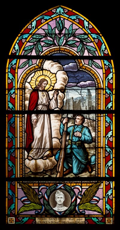 POP | Plateforme ouverte du patrimoineEnsemble de 6 verrières (vitrail tableau) : Apparition du Christ à sainte Marguerite-Marie Alacoque, apparition de la Vierge à Bernadette Soubirous, Assomption, Christ bénit un soldat (le), soldat tombant devant un Christ en croix, Christ bénit un soldat mourant (baies 5 à 10)