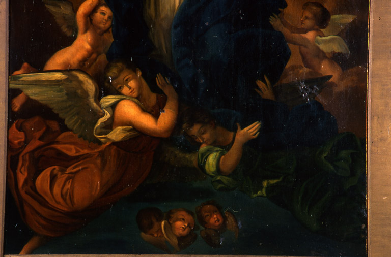 La toile est trouée par endroits ; une planche, fixée en bas du tableau, en cache une partie ; on remarque la présence de restaurations anciennes