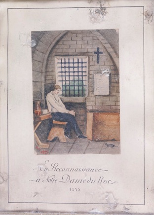 En Reconnaissance / à Notre Dame du Roc / 1875 (en noir sur le papier blanc) ; Gx. / 1881 (en bas à gauche en rouge, sur l'aquarelle).