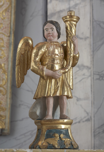 Deux statuettes ayant pour fonction d'être des porte-cierges. Elles sont en noyer taillé, en plusieurs éléments assemblés par des clous. Les statuettes sont dorées à la feuille d'or et peintes polychrome.