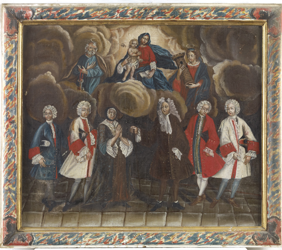 Des hommes et une femme en habits bourgeois sont représentés sous la Vierge à l'Enfant entourée de saint Pierre et de sainte Barbe.