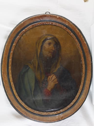 Tableau de forme ovale constitué d'une toile en un seul lé, au tissage régulier et serré avec une préparation de couleur rouge et une épaisseur de couche picturale moyenne. Cadre rapporté en bois peint polychrome.