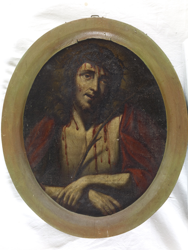 Tableau de forme ovale constitué d'une toile en un seul lé, au tissage régulier et serré avec une préparation de couleur rouge et une épaisseur de couche picturale moyenne. Cadre rapporté en bois peint polychrome.