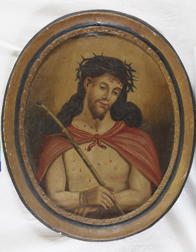 Tableau de forme ovale constitué d'une toile en un seul lé, au tissage régulier et lâche avec une préparation de couleur blanche et une épaisseur de couche picturale moyenne. Cadre rapporté en bois peint polychrome.