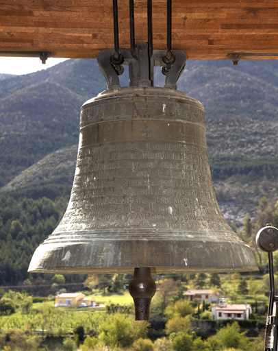 Cloche suspendue à un mouton en chêne (?) à l'aide de ferrements. Battant en acier moulé, à boule.