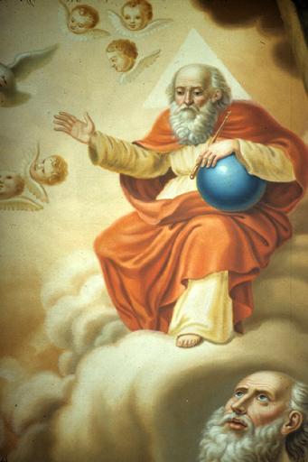 saint Jacques le Majeur : pèlerin (livre, épée) ; saint André apôtre ; Trinité (Dieu le Père, Christ glorieux, croix, colombe), nuée, angelot ; figures (homme, femme, en buste)£saint Pierre apôtre, fond de paysage£saint Paul de Tarse, fond de paysage£saint Joseph, sainte Anne (livre), fond de paysage£saint Eloi, saint Antoine abbé, fond de paysage