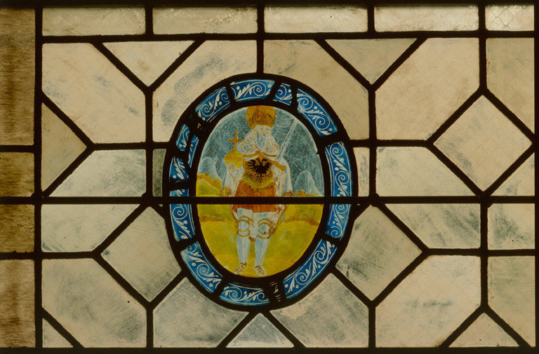 Panneaux peints en grisaille et jaune d'argent comportant quelques verres colorés : la robe et les nuages bleus de la Vierge à l'Enfant et les verres bleus gravés des bordures décoratives des médaillons ovales ; emploi de sanguine pour le médaillon montrant Charlemagne ; vitrerie à bornes de complément entre les médaillons (partie inférieure de la baie)