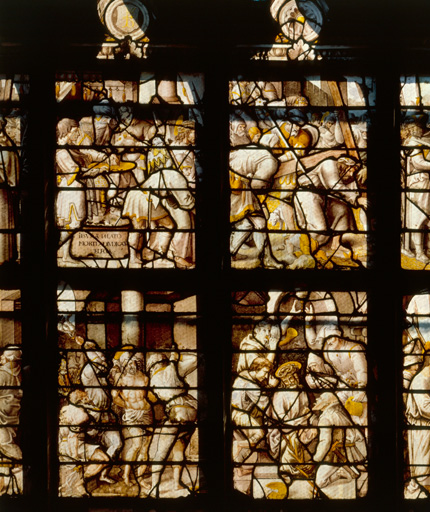 3 registres, tympan à 8 mouchettes, 3 soufflets, écoinçons.£Email sur verre : dans les motifs décoratifs entourant les armoiries du tympan