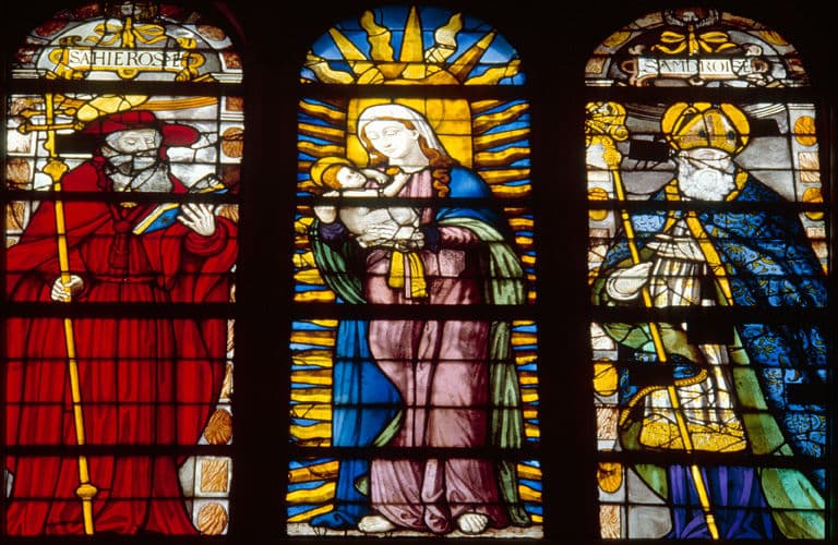 verrière figurée : saint Nicolas, Vierge à l'Enfant (baie 106)