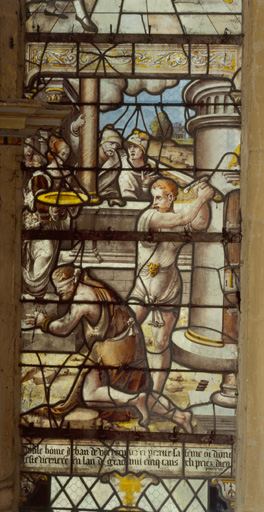Lancette à double amortissement (2 registres), tympan à 1 soufflet et écoinçons.£Scènes peintes en grisaille sur verre, jaune d'argent et sanguine sur verre à l'exception du ciel (bleu) ; étoiles montées en chef-d'oeuvre dans l'écu de droite