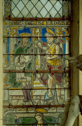 Du saint Jean-Baptiste présentant le donateur il ne reste plus que les attributs (calice et serpent) ; vitrerie losangée du 20e siècle en complément