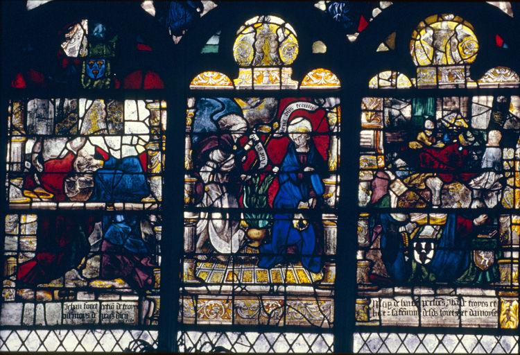 inscription de donation (incomplète) en soubassement des panneaux gauche et droit des lancettes ; armoiries (identifiées) : armoiries du donateur : Jehan Foret ; armoiries (non identifiées) : armoiries de la donatrice