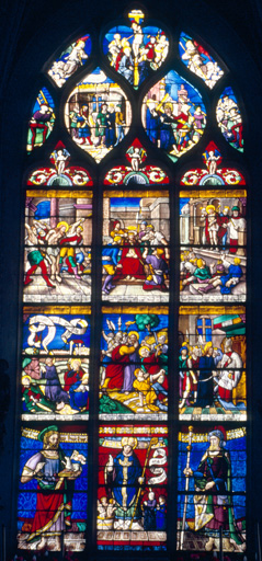 Verrière de la Passion du 1er quart du 16e siècle dont les panneaux du registre supérieur (flagellation, couronnement d'épine, Ecce Homo) et les 2 panneaux de droite du registre médian (Baiser de Judas, Jésus devant Caïphe) sont du 19e siècle