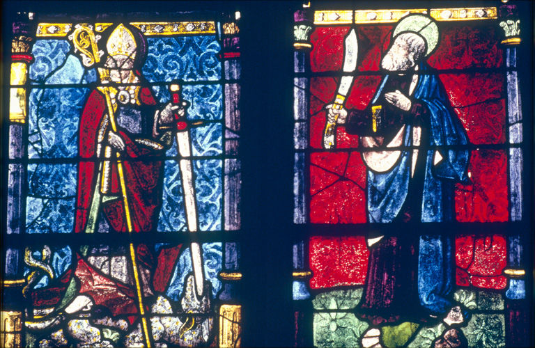 Verrière réalisée vers 1500 1510, don de Nicolas Forjot, abbé de saint Loup de Troyes (10) ; la Vierge de Pitié du tympan est apparentée à celle de saint Pouange (10)