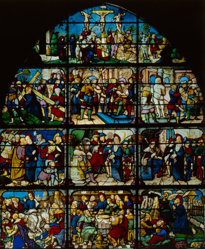 Verrière dont les 3 registres supérieurs (amortissement compris) ont été réalisés vers 1525-1530 par Jean Verrat et Balthazar Godon ; le registre inférieur (Entrée à Jérusalem, Cène, Agonie du Christ) date de 1861 et est l'oeuvre de Vincent-Larcher ; selon un document conservé dans les notes de Nioré, cette verrière proviendrait de l'église de Lirey (10).
