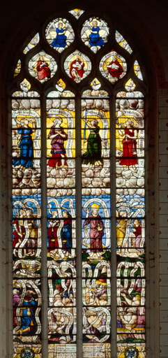 tous les personnages des lancettes sont entourés de grands phylactères décoratifs et votifs ; inscription de donation et de datation dans un cartouche au bas des 2 lancettes centrales ; armoiries (non identifiées) : armoiries (peut-être du donateur Jean Colet) dans des chapeaux de triomphe tenus par des griffons au bas des 2 lancettes latérales