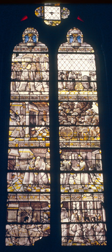 verrière (grisaille figurée) : légende de l'hostie (baie 3)