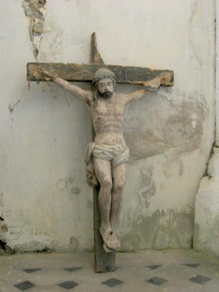 Le bois se désagrège. La branche supérieure de la croix est cassée.£Il manque les deux mains du Christ.
