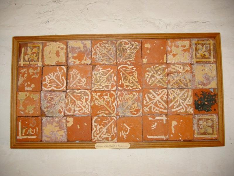 A l'origine, ces carreaux composaient le sol de la sacristie : ils ont été déposés et placés dans un encadrement sur les murs de la nef. Carreaux de pavement mentionnés dans l'ouvrage de C. Fichot, Statistique monumentale de l'Aube, t. 1, Troyes, 1884, p. 384.