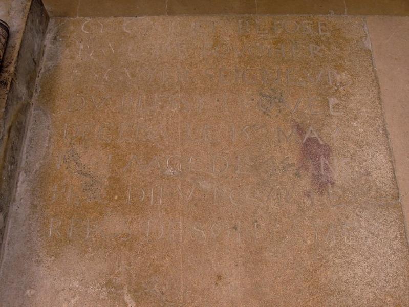 Transcription : CY GIST ET REPOSE / PAUL DE BOUCHER / ESCUYER SEIGNEUR / DU PLESSY LEQUEL / DECEDA LE 15 MAY / 1621 AAGE DE 45 ANS / PRIE DIEU POUR LE / REPOS DE SON AME.