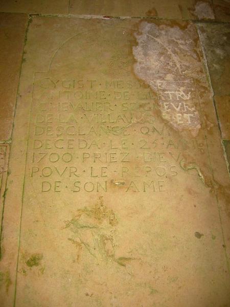 Ecu chargé d'un lion rampant. Texte en capitales latines dans le champ. Transcription : CY GIST MESSIRE / ANTOINE DE MERTRUS / CHEVALIER SEIGNEUR / DE LA VILLAUBOIS ET / D'ESCLANCE QUI / DECEDA LE 25 AVRIL / 1700 PRIEZ DIEU / POUR LE REPOS / DE SON AME.