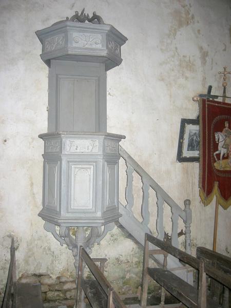 La tribune repose sur le sol par l'intermédiaire d'un balustre renforcé de consoles. Panneaux sculptés sur l'abat-voix et le garde-corps.