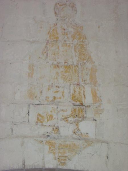 Peinture appliquée directement sur la pierre.£En hauteur, au-dessus de la porte ouest, à environ 3 mètres du sol.