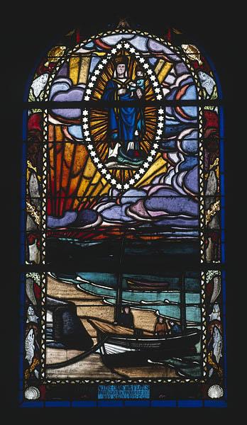 La Vierge à l'enfant représentée sur cette verrière figure la Vierge protectrice des marins (elle est entourée d'un décor maritime) dont une statue est conservée dans l'église.