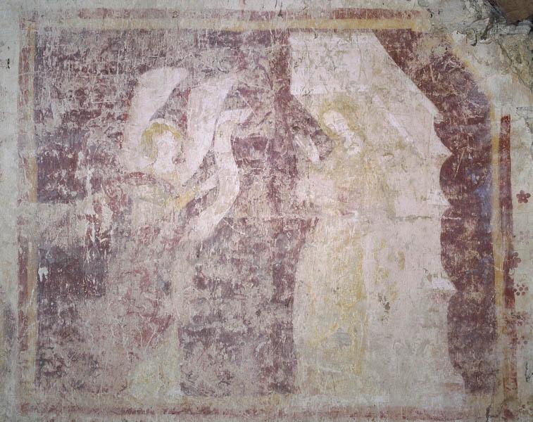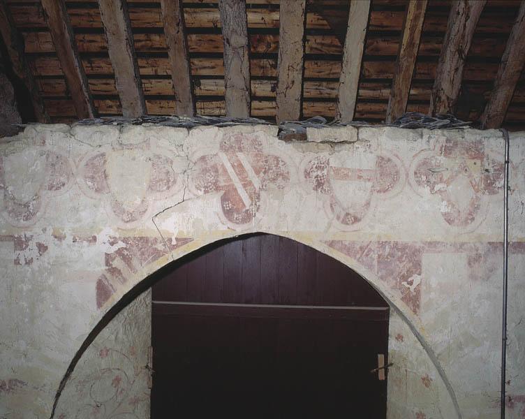 Description : pièce du rez-de-chaussée : traces de scènes illisibles sur le mur nord, frise de quadrilobes contenant des écus armoriés tout autour de la partie supérieure de la pièce, décor illisible sur les poutres de l'ancien plafond ; pièce de l'étage : scènes illisibles sur le mur sud encadrées par un décor de faux appareil, double frise dans la partie supérieure l'une nue, l'autre à écus armoriés dans quadrilobes, saint Michel terrassant le dragon et Annonciation sur le pignon est ; dans les embrasures des baies des deux pièces : semis de fleurs, rinceaux ou ornements géométriques.