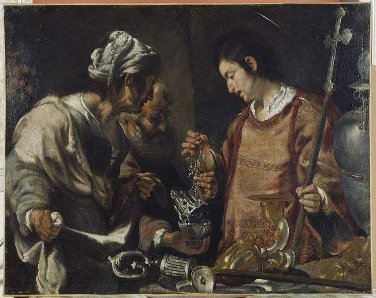 scène historique (saint Laurent diacre, don, vieux, vieille, orfèvrerie, aiguière, calice, crosse, encensoir)