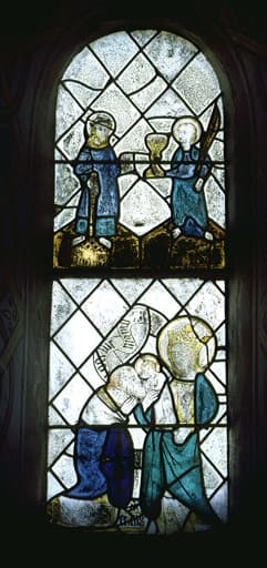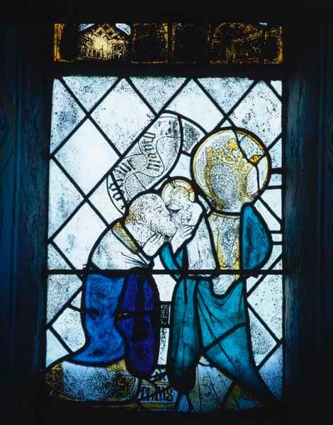 verrière figurée : Vierge à l'Enfant avec donateur, saint Jean l'évangéliste, saint Jacques le Majeur