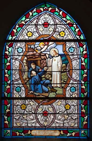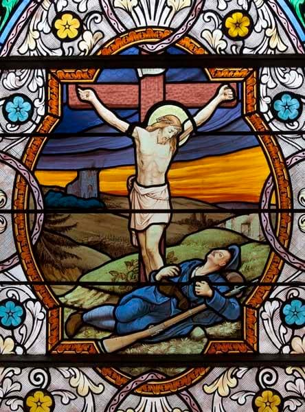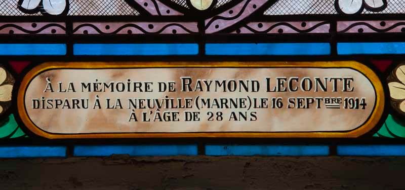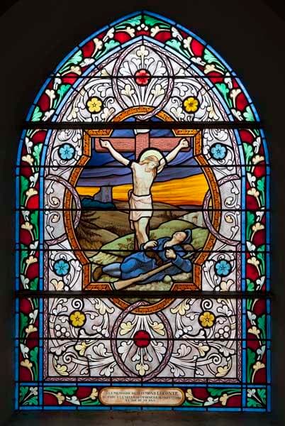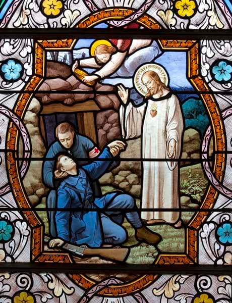 POP | Plateforme ouverte du patrimoineensemble de 2 verrières figurées commémoratives : Apparition du Sacré-Coeur de Jésus à un soldat de la Grande Guerre, Poilu au pied du Christ en croix