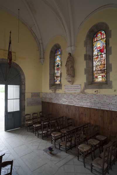 Dès la fin de la guerre, le père Chauvin (curé de Rully entre 1899 et 1934) et Armand Dubosq (maire de la commune) décidèrent, avec le soutien de labbé Mariette (chanoine honoraire de Bayeux), dériger une petite chapelle du souvenir en bordure du village. Elle ferait office de monument aux morts pour commémorer la mémoire des victimes de toutes les guerres. Le maire offrit le terrain et la construction fut financée par les dons de familles endeuillées (de la commune de Rully et dautres communes alentour), auxquels vinrent sajouter le produit de quêtes et un don personnel du curé. La réalisation des quatre verrières fut confiée à Charles Lorin, peintre verrier à Chartres, qui avait déjà uvré à plusieurs reprises dans léglise paroissiale. Lui-même avait perdu son fils Etienne à la guerre, dont le nom figure sur lune des soixante-six petites plaques de marbre blanc posées sur les murs. Elles portent chacune le nom dun soldat tué au combat. Les quatre baies, reprenant des figures traditionnelles des verrières commémoratives exécutées par latelier, sont organisées selon un même modèle : le saint, occupant les trois quarts supérieurs de la lancette, est représenté sous un dais architecturé trilobé à redent surmonté dun fronton ; dans le registre inférieur, une frise architecturée interrompue par un arc trilobé abrite une reproduction en grisaille dun lieu de pèlerinage. La chapelle fut consacrée le dimanche 22 août 1920 par l'évêque de Bayeux Mgr Lemonnier, en présence de C. Cautru député du Calvados, lors dune grande cérémonie festive. Lannée suivante, le Conseil municipal accepta que les corps de deux soldats du village tués à la guerre, Alcide Porquet et Armand Chancerel, y fussent inhumés, selon les vux des familles. Dabord propriété de labbé puis du diocèse de Bayeux en 1927, lédifice fut cédé par celui-ci à la commune en 1976.